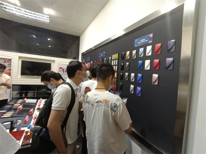 在萬輝色卡房參觀與講解環(huán)節(jié),學員們對萬輝感溫變色涂料、變色龍涂料、彩虹效果涂料等特殊效果表示有更進一步的深入了解需求,特別是在電子煙及家電應用上。
