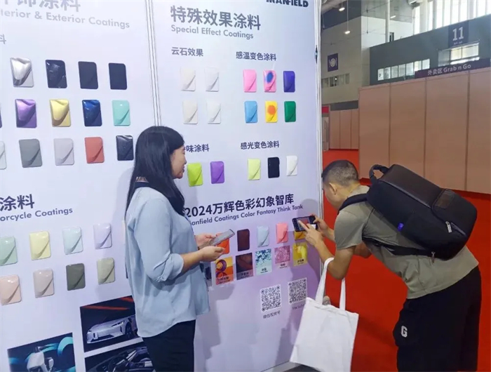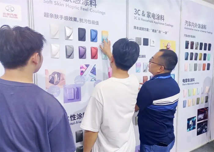 萬(wàn)輝集團(tuán)以“納米膚感涂料”、“汽車(chē)內(nèi)外飾涂料”、“3C&家電涂料”、“電摩車(chē)涂料”、“特殊效果涂料”5大主題進(jìn)行產(chǎn)品展示。其中,萬(wàn)輝兩大創(chuàng)新產(chǎn)品:納米膚感涂料、汽車(chē)輕質(zhì)化碳纖維基材的高效涂裝吸引了展會(huì)客戶的重點(diǎn)關(guān)注及初步的合作意向。