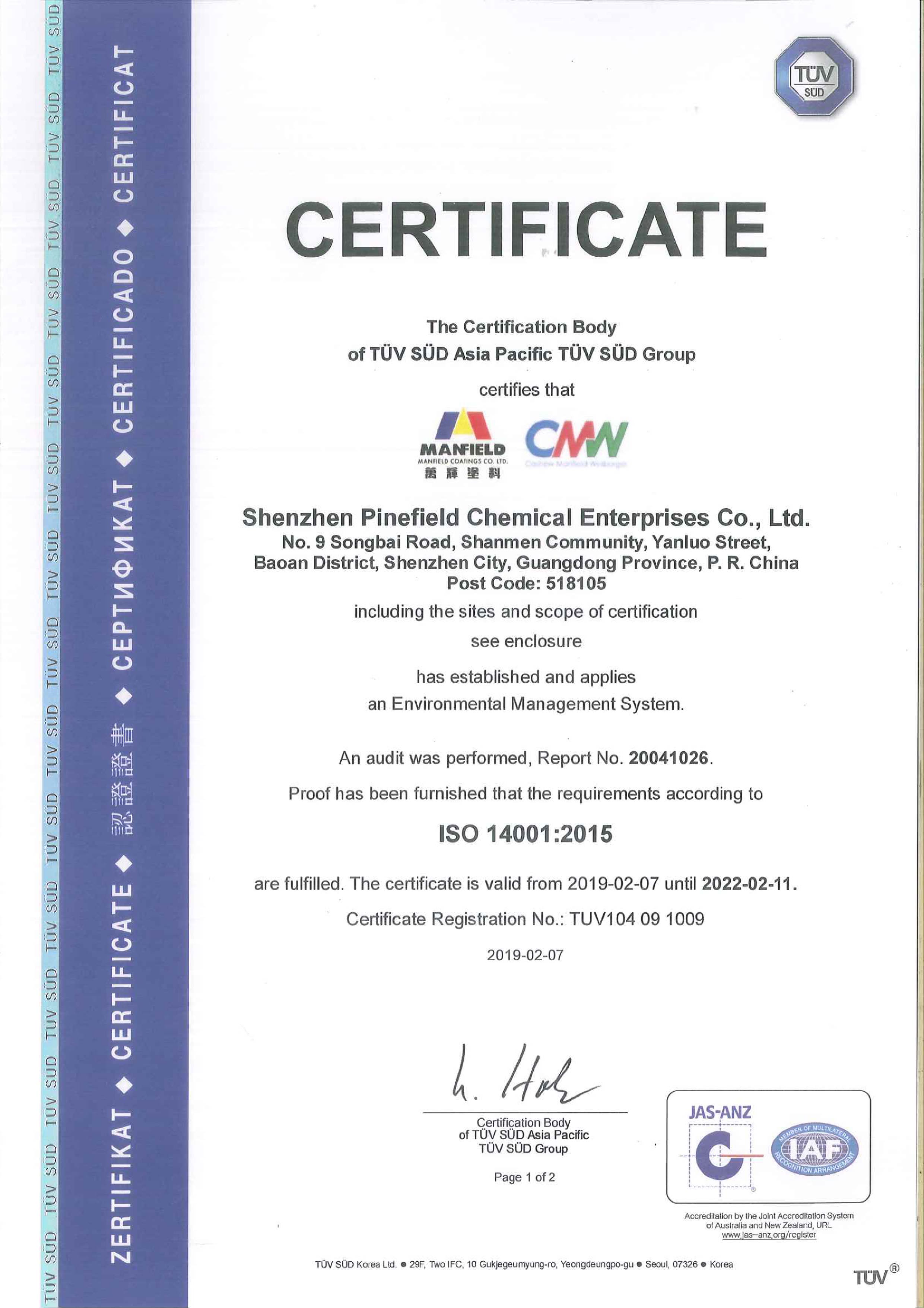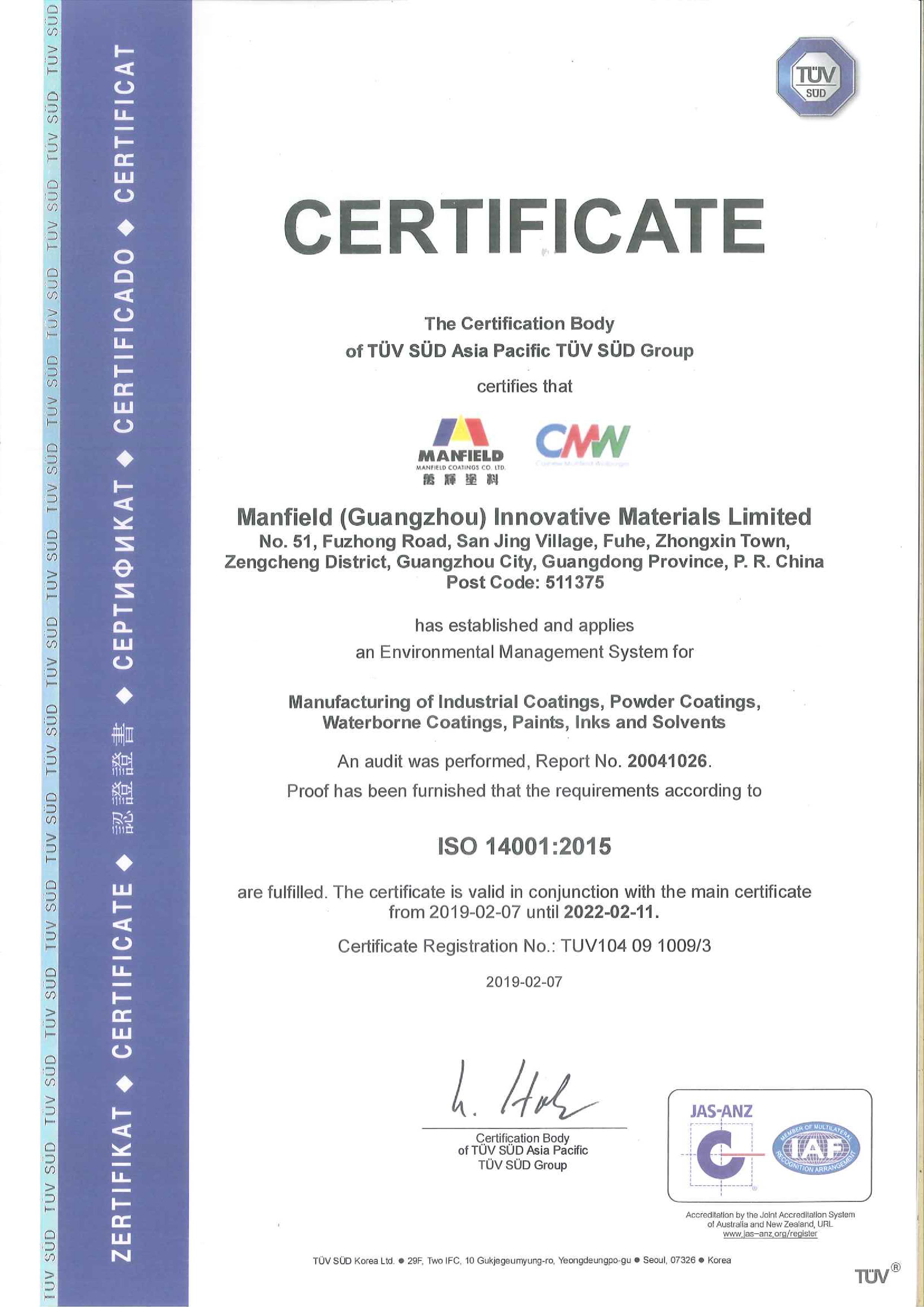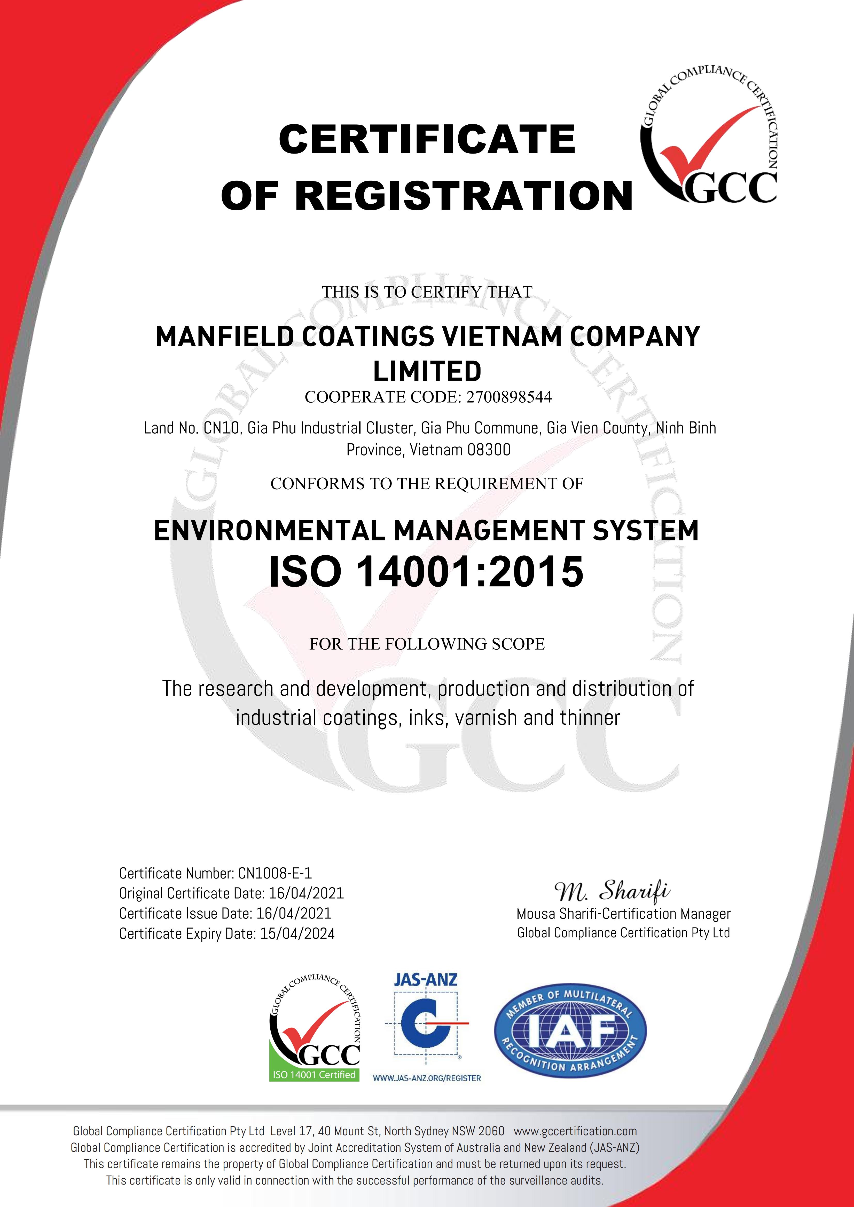 TUV ISO 14001: 2015(Manfield Coatings Viet Nam)